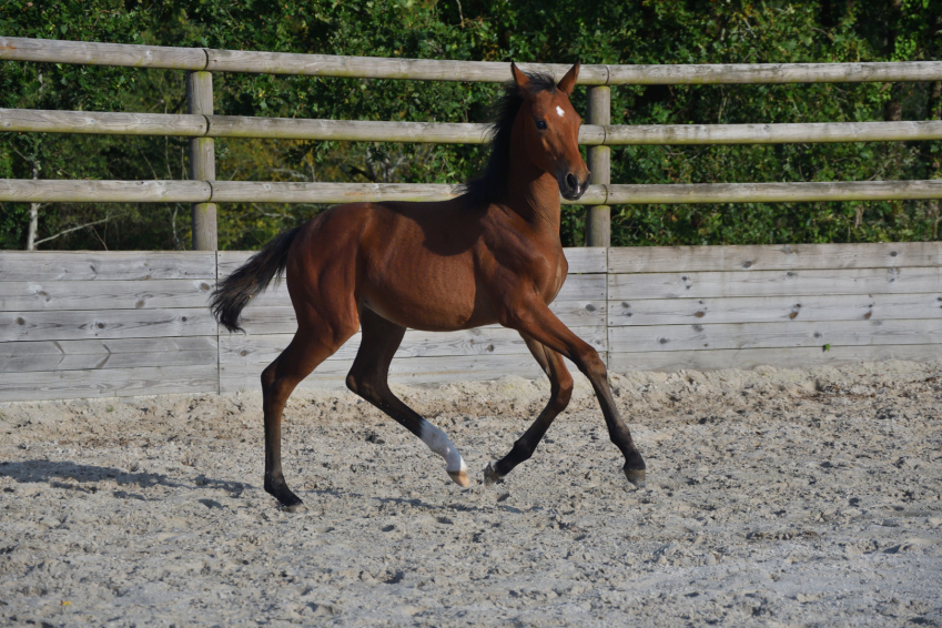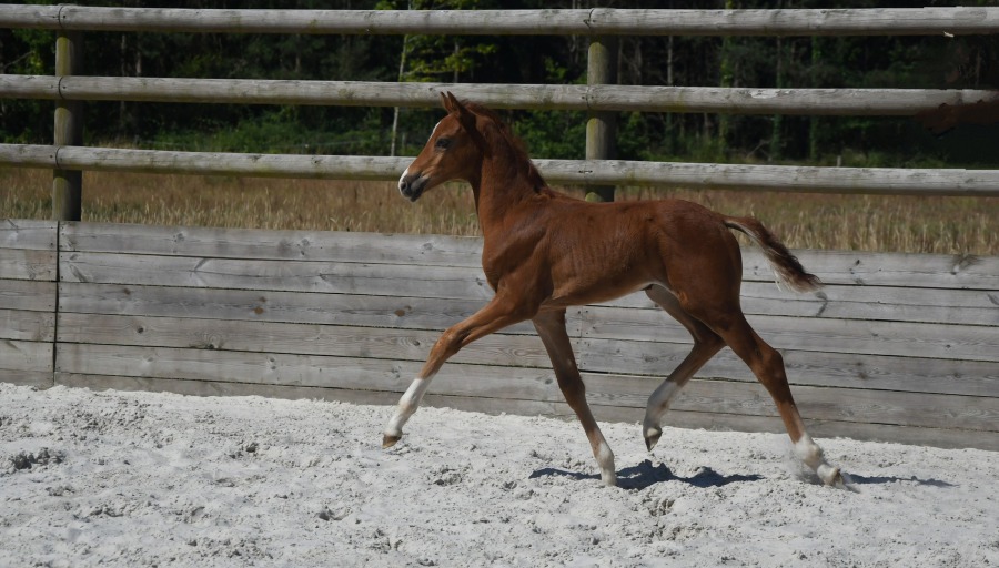 Magnifique pouliche, chic, avec de beaux points de force, qui montre des aptitudes polyvalentes : de l'influx, trois allures pour le dressage, une belle charpente. Potentiel dressage, cso et cce. Un tempérament curieux, proche de l'homme et plein d'energie.